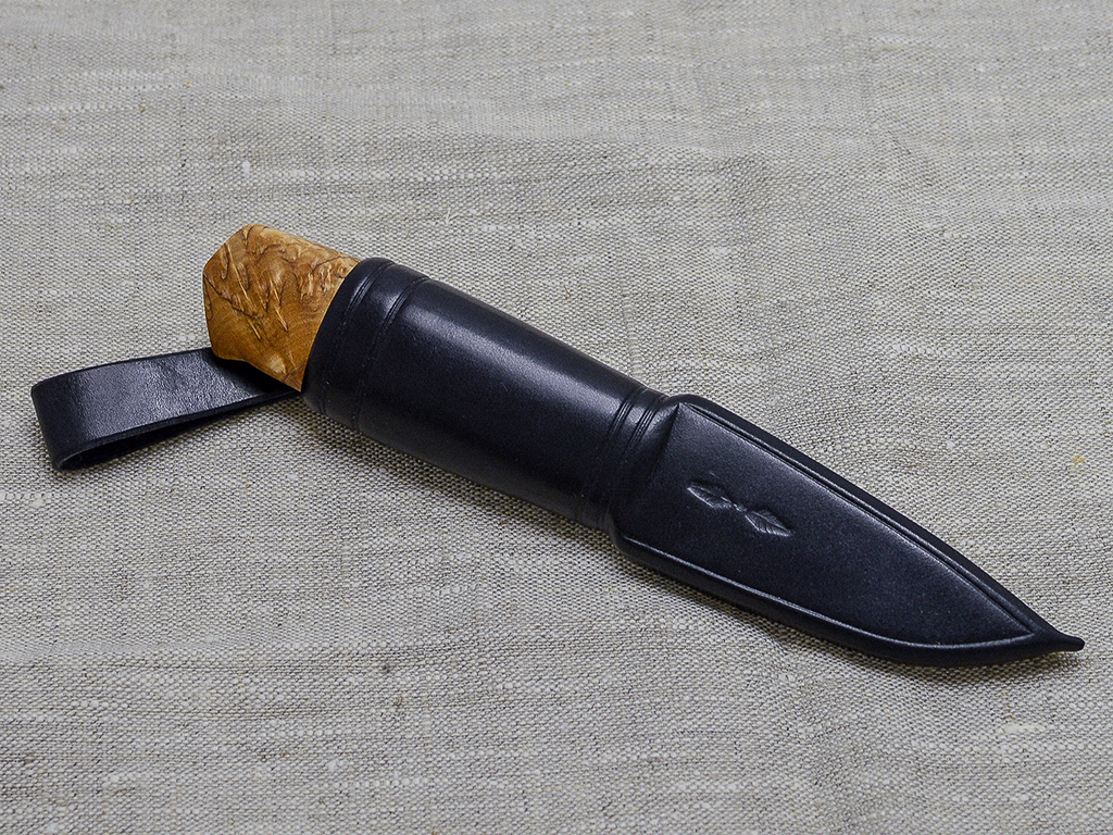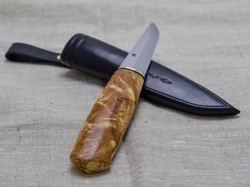 Badger- model puukko with stabilized x-cut curlybirch handle, brass fittings with ebony ring, carbon steel 80CrV2 blade 80 mm. Blade acid treated to achieve satin finish. Black leather sheath.