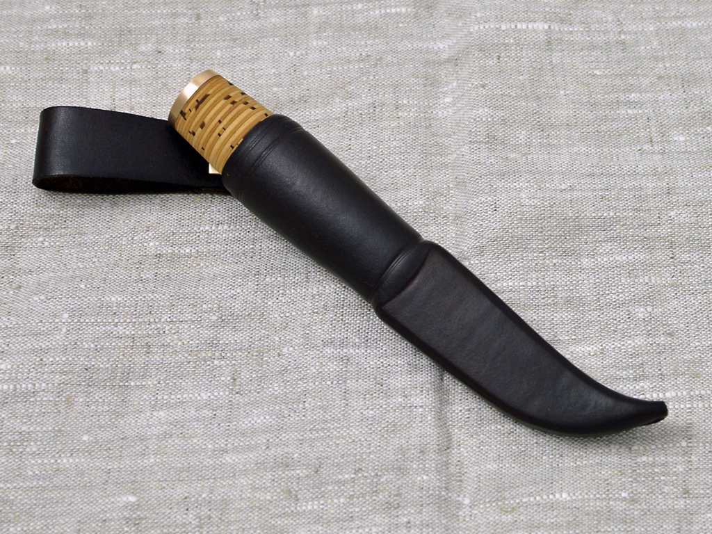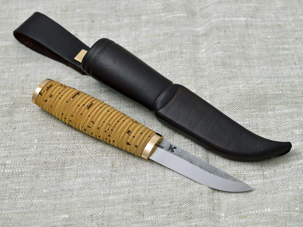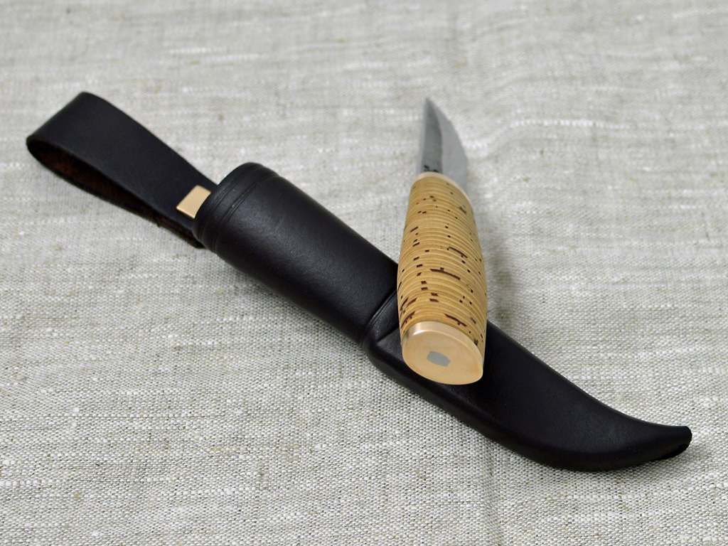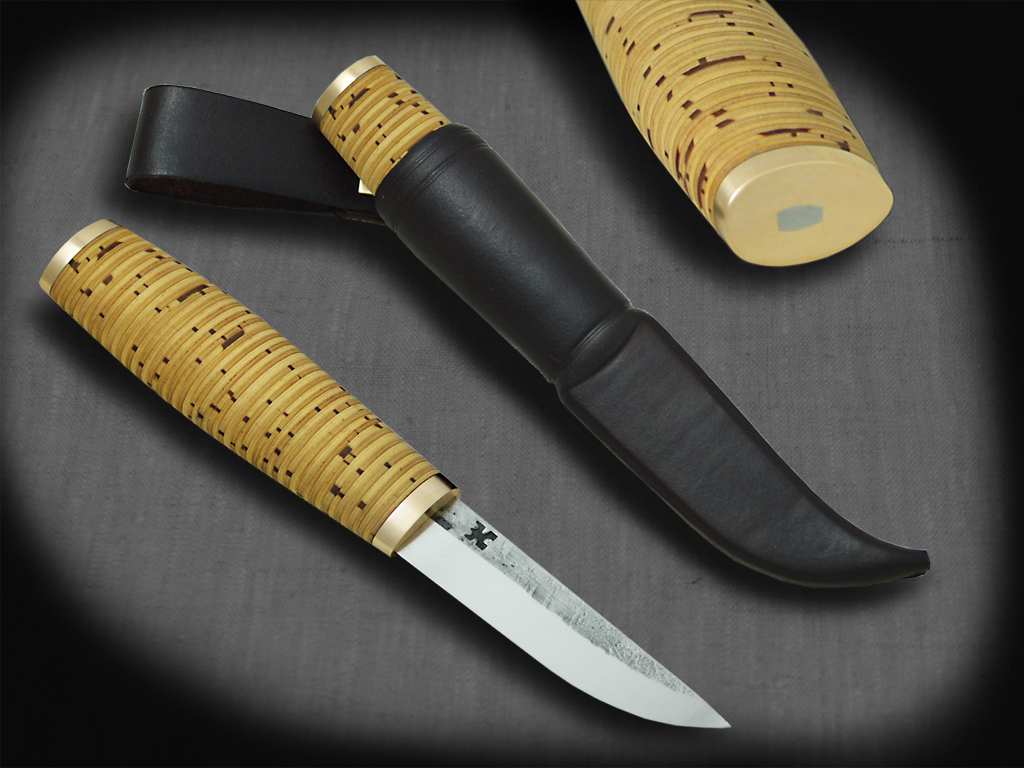 Birch bark handle puukko with polished hammered side blade. Blade 80crv2 carbonsteel 75 mm, handle birch bark with bronce fittings 105 mm. Leather sheath.
