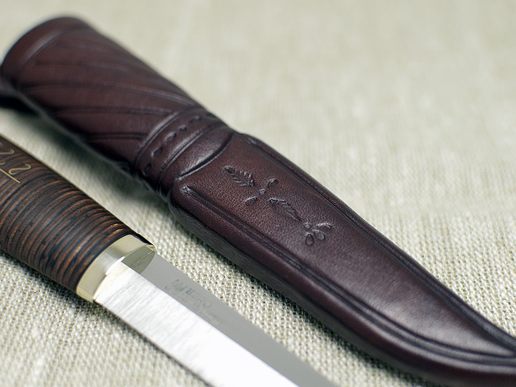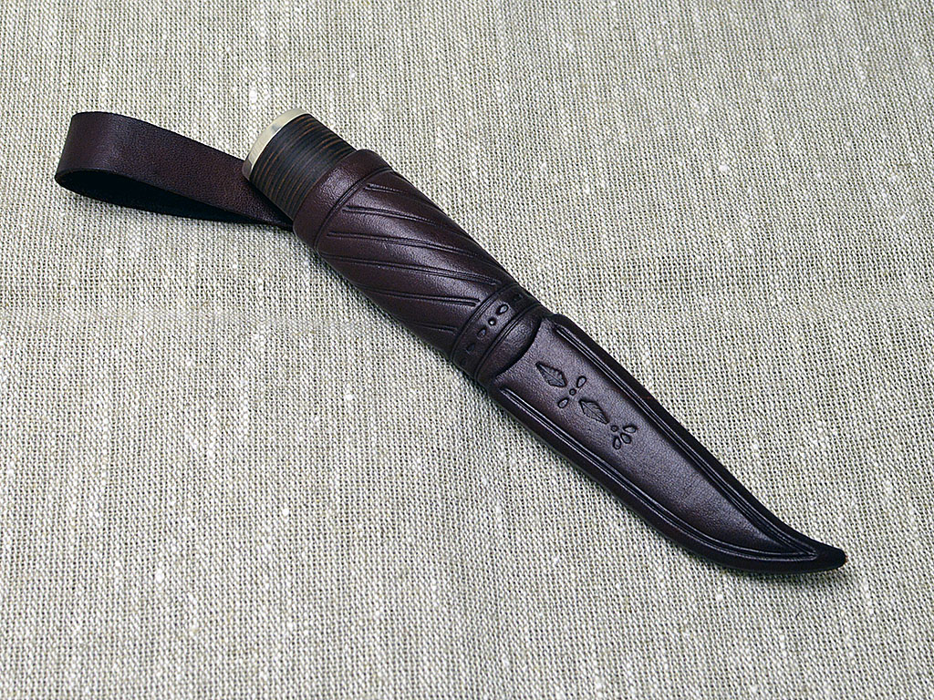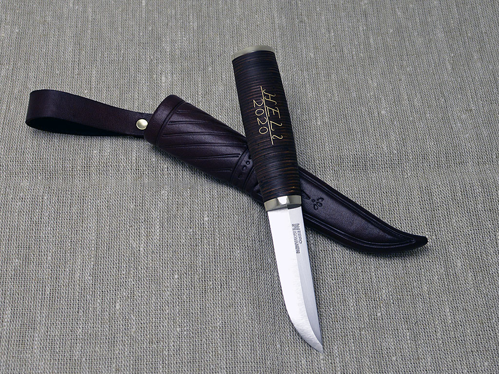 Gift puukko with carbon steel blade 85 mm, german silver fittings, birch bark handle with brass inlay. Leather sheath. Made as a gift, receiver`s name and giving year inlaid. Custom order.