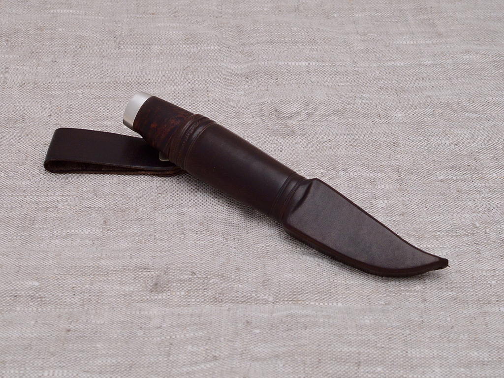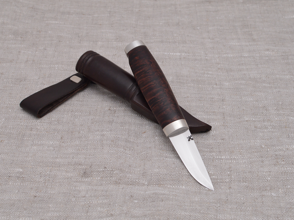 70 mm carbon steel puukko blade, 925 silver fittings with brushed look. Dyed and oiled curly birch handle. Leather sheath with sheath liner, silver rivet in carrying loop.