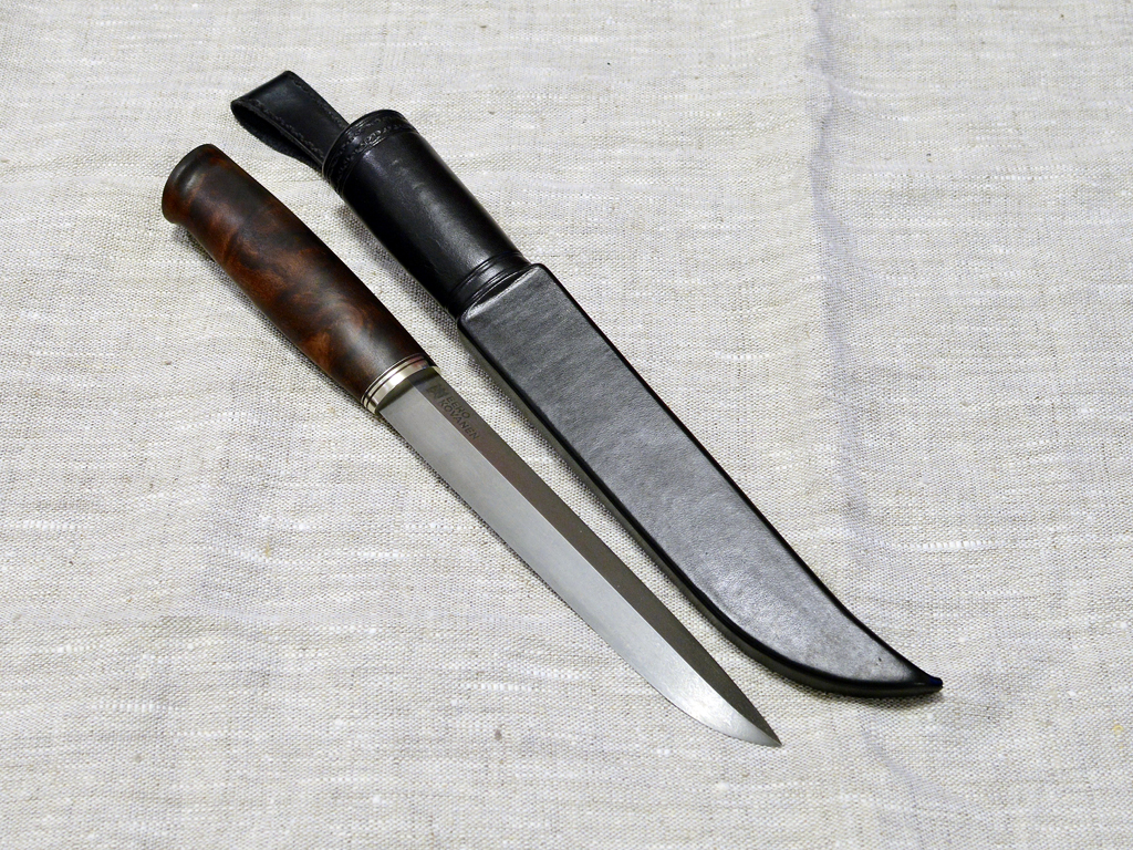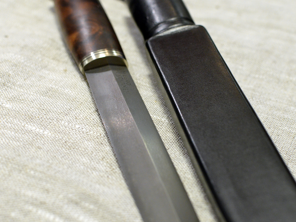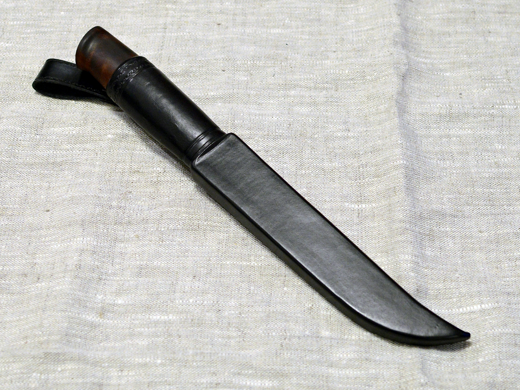 170 mm wootz steel blade made from self made wootz steel. German silver fittings and 120 mm pepperwood handle. Black leather sheath with wooden sheath liner.