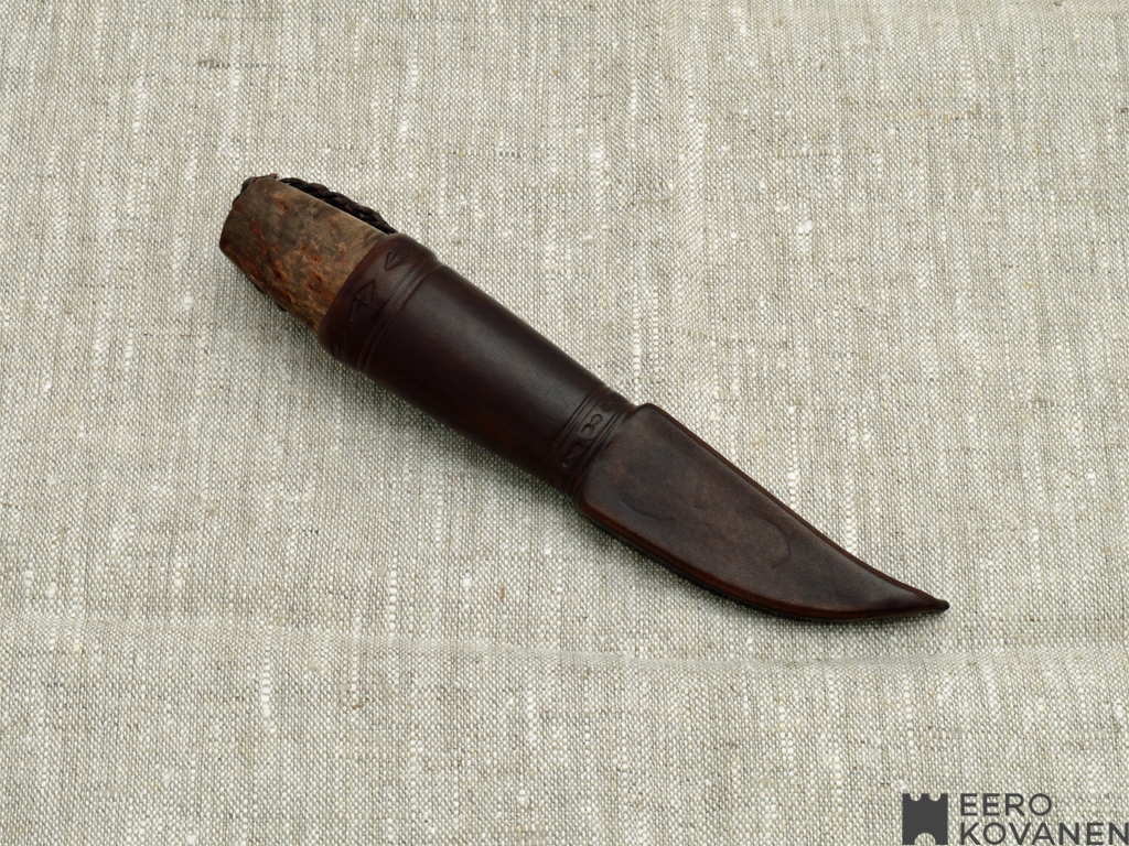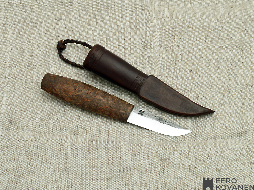 70 mm carbon steel blade fitted in curly birch handle. Light and nice shaped puukko for all use. In leather sheath puukko is safe to carry with you where ever you go.