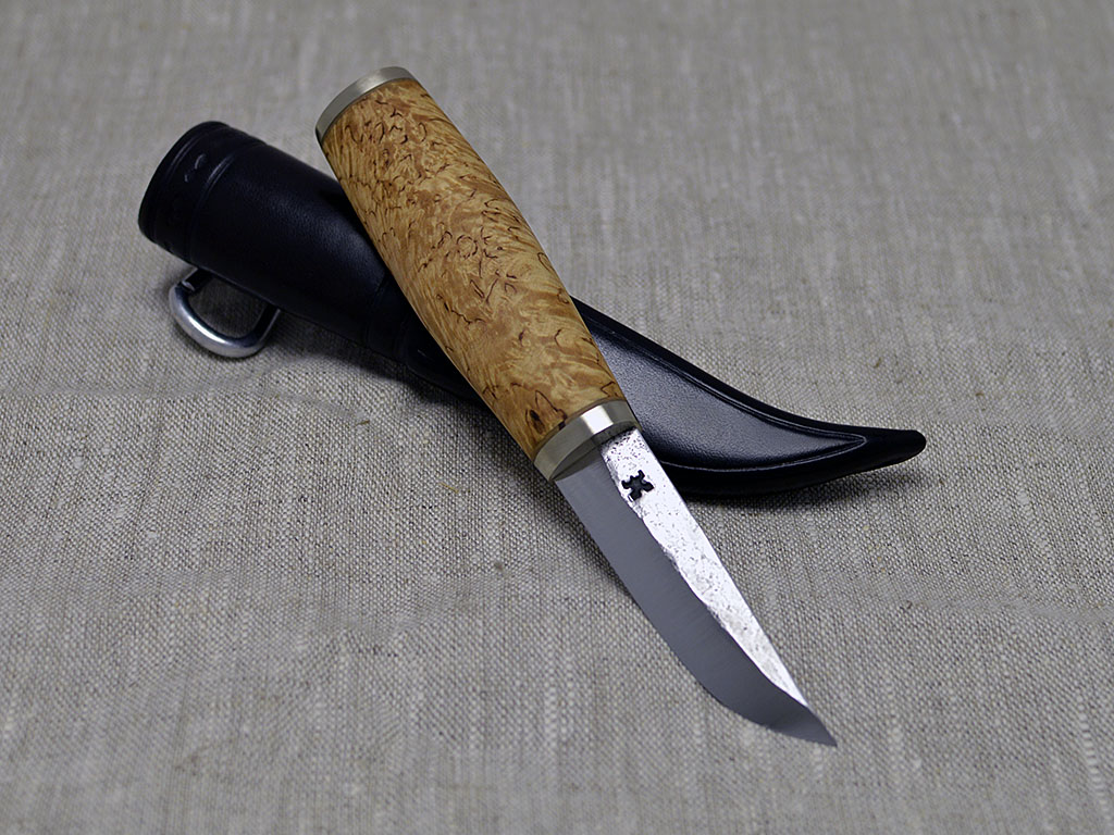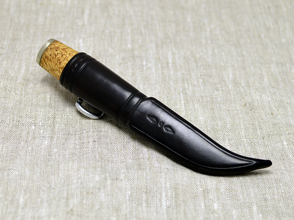 Puukko made for carpenter, carbon steel blade 70 mm, german silver fittings, curly birch handle. Leather sheath with carbine hook as carrier.