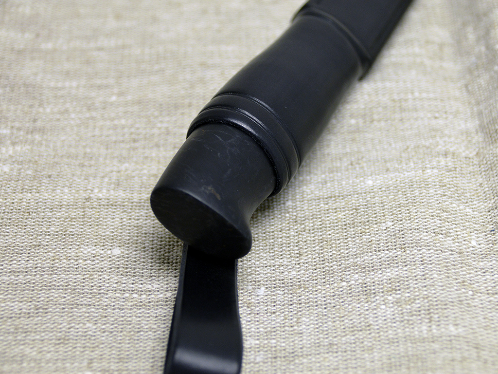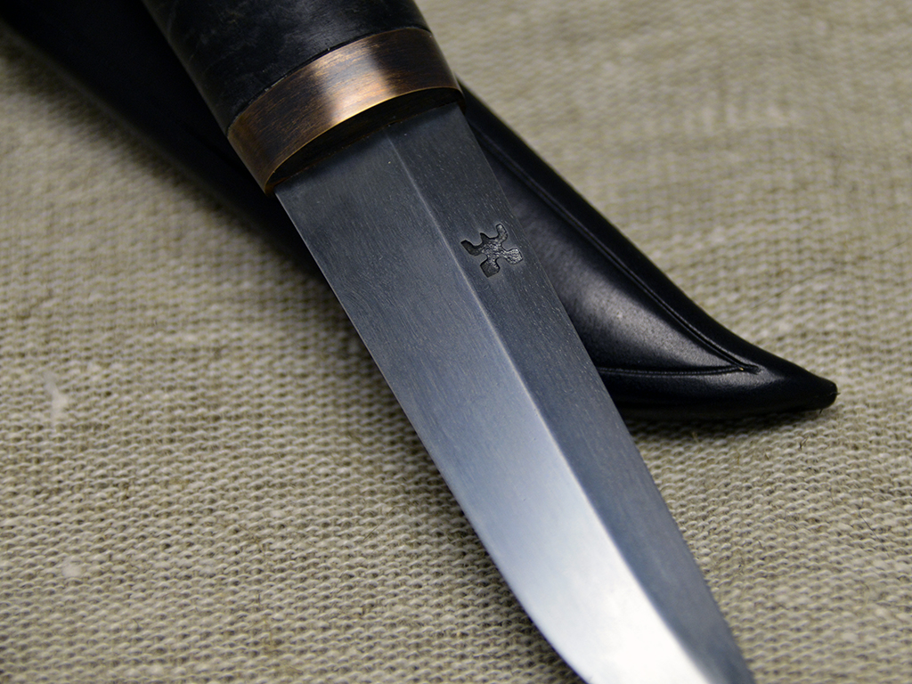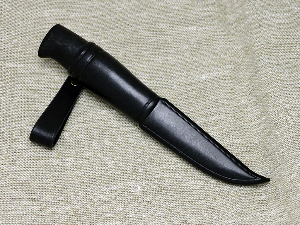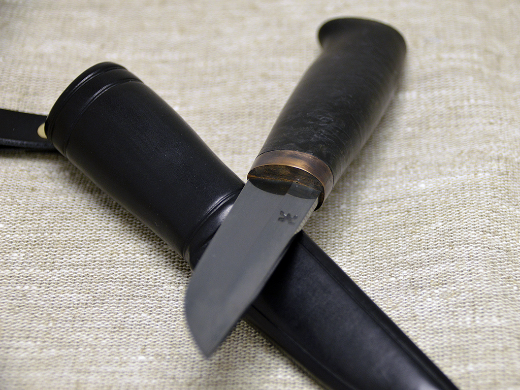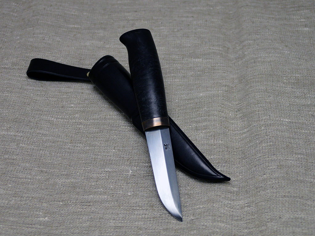 Puukko with curly birch handle, dyed black. Patinated brass fitting. 90 mm Wootz blade, patinated. Black leather sheath.
