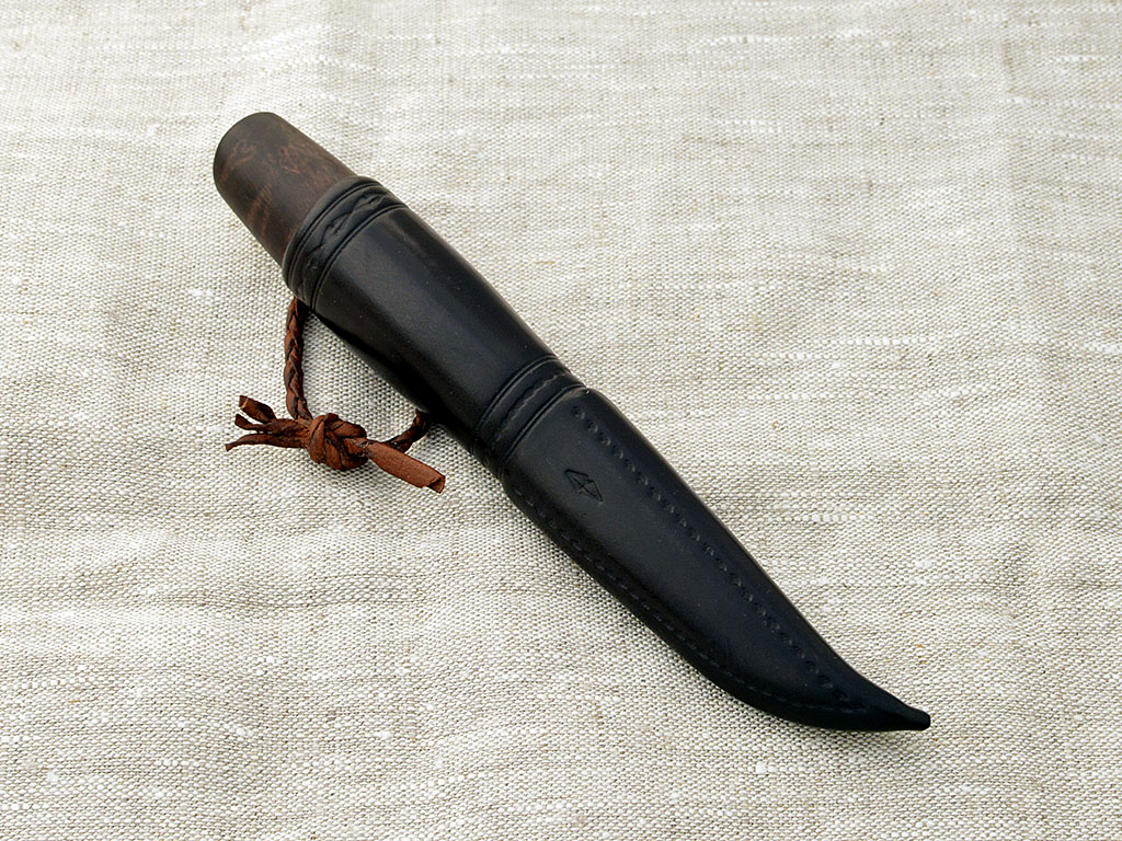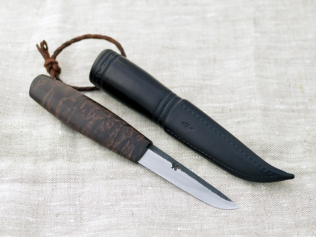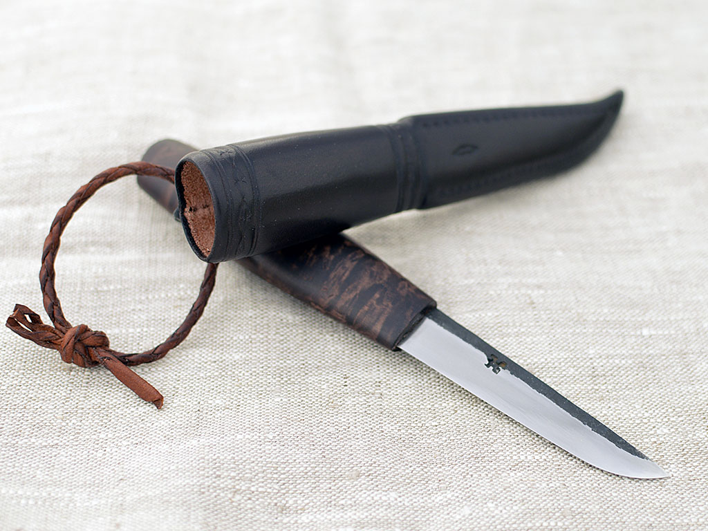 Blacksmith`s puukko with slim design. Carbon steel “silver steel” (115CrV3) blade 75 mm. Curly birch handle. Leather sheath with weaved leather carrier.