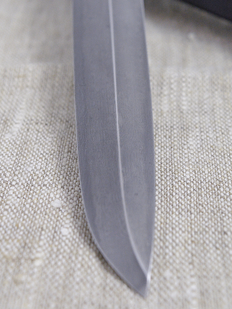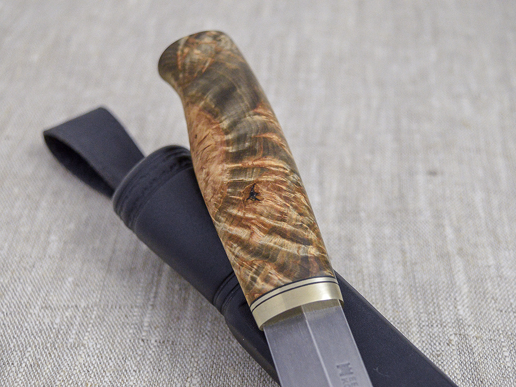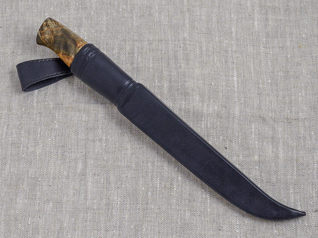 Wootz bladed knife with nickel silver fitting, stabilized x-cut curly birch handle. Blade length 225 mm. Black leather sheath.